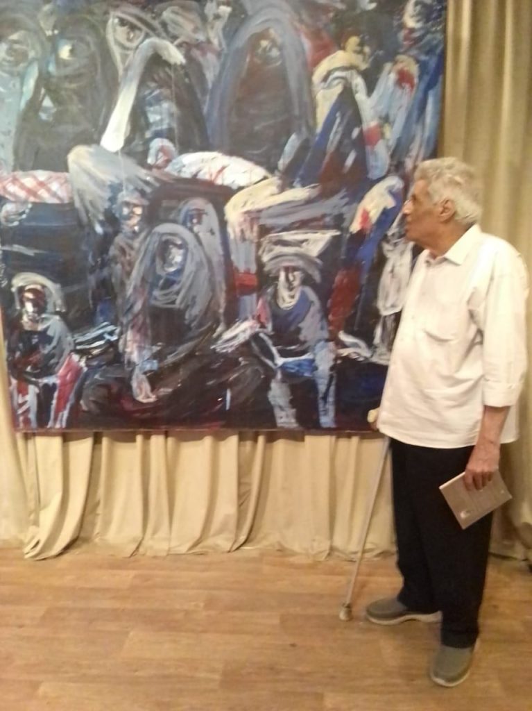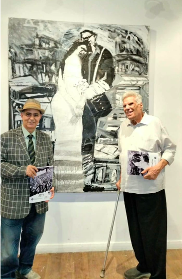 لوحة الزفاف التي اختارها الفنان نقطة مركزية لملصق المعرض قال عنها إنها تروي الصمود والأمل رغم الركام ورأيتها وأنا أدعو الأديب الكبير لنأخذ صورة تذكارية أمامها عنوانا لزفاف الأزواح الشهيدة إلى السماء. هكذا الفن منفتح على التأويل.