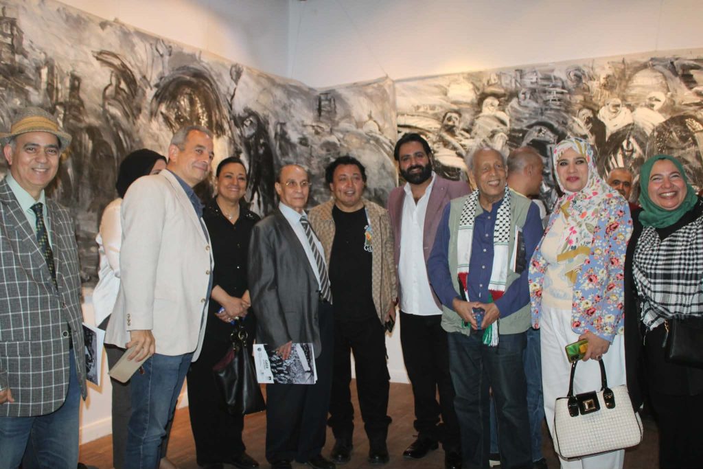 اختيار قاعة الهناجر لم يكن عابرًا، بل بدا ملائمًا لاحتضان جدارية «يوميات غزة» الممتدة على ثلاثين مترًا، والتي أعادت صياغة المأساة باللونين الأسود والأبيض بصريًا، عبر تراكمات لونية كثيفة لاعمال خارج الجدارية تنبض بذاكرة الألم. في هذه الأعمال، لا يكتفي الفنان بالتوثيق، بل يعيد بناء الحدث جمالياً وروحيًا؛ فالأجساد المندمجة في العتمة، والضوء الرمادي الخافت، يمنحان المشاهد إحساسًا بمرثية بصرية تتصاعد من قلب الدمار.