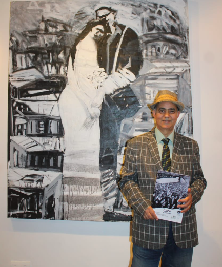 التقطتني عدسة الفنان والناقد الدكتور كمال هاشم وأنا اتجول أمام الجدارية. كانت صامتة ولكن مع صوت فيروز في القاعة كنت أصغي للصرخات والأنين والنداءات التي اطلقتها الوجوه في لوحات رسمتها الأحبار الممتزجة بدموع الفنان وهو يعمل قبل أن تجف. يعيش الفنان في الغربة الالم مضاعفا ولا يواسيه الا العمل على توثيق المأساة.